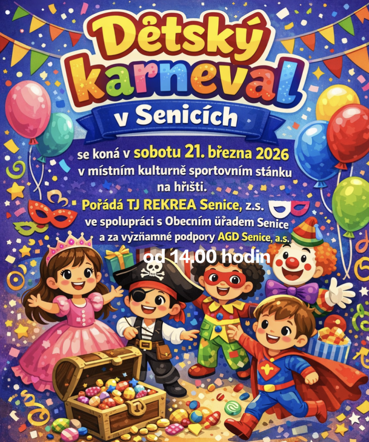TJ Rekrea Senice, z.s. ve spolupráci s Obecním úřadem Senice a za významné podpory AGD Senice, a.s. Vás srdečně zve na dětský karneval, který se koná v sobotu 21.března 2026 od 14:00hod.
