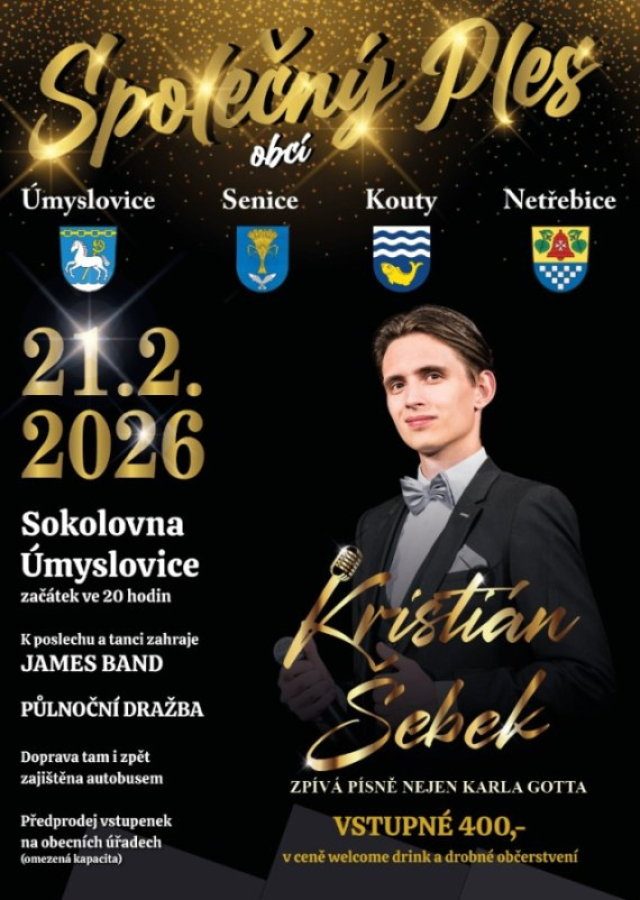 3. Společný ples, který se uskuteční 21. 2. 2026 od 20:00 v sokolovně v Úmyslovicích.