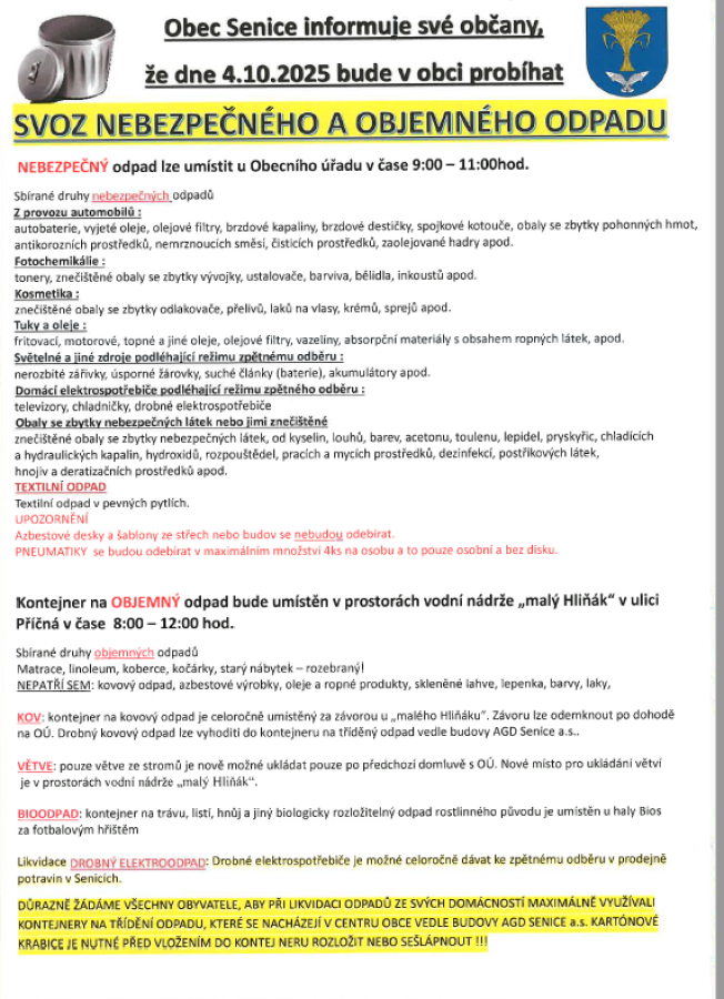 Dne 4.10.2025 bude v obci probíhat svoz nebezpečného a objemného odpadu.